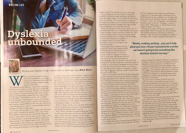 I have written an article on the rewards and challenges of writing with dyslexia for the wonderful ‘Writing Magazine’ February 2022 edition.